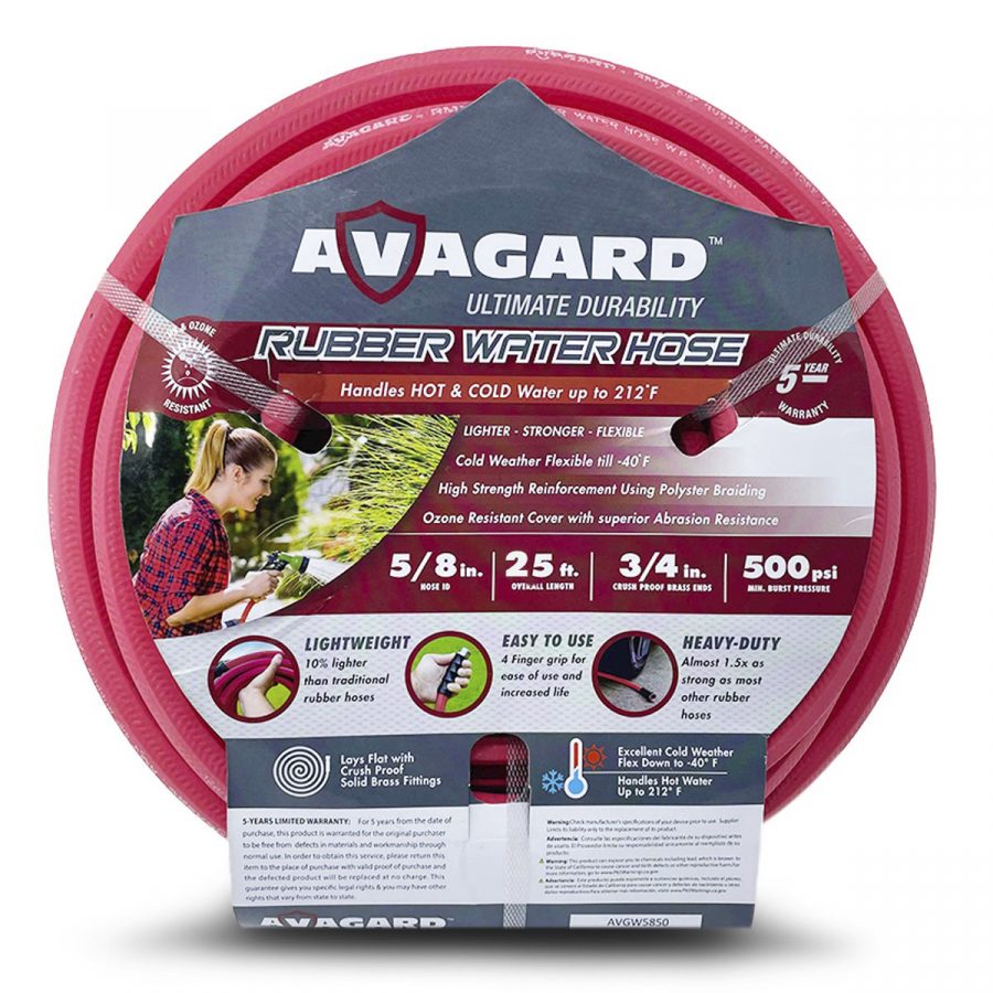 Industry best 5-Year Warranty. The Avagard garden hose made of 100% rubber. It is 20% lighter than traditionally made rubber water hoses and is also more flexible and stronger. The Avagard water hose handles hot water to 212°F and is a great mid-price option.