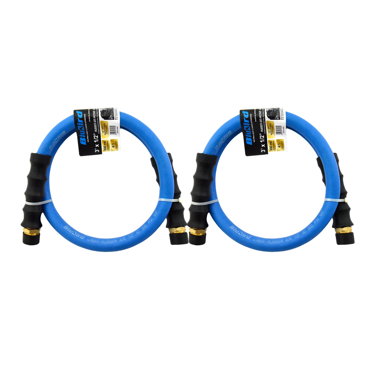 Enjoy the benefits of a top-tier 90-Day Warranty. The BluBird 1/2-inch rubber lead-in hose serves as the ideal connection for supply lines, hose reels, compressors, and various system components. These shorter hoses effectively prevent vibrations from moving parts, reducing the risk of leaks or loose connections. Crafted entirely from 100% rubber, this hose offers heavy-duty durability, all while remaining lightweight and highly resistant to abrasions. Additionally, this hose helps keep your supply hose on the ground, significantly reducing the risk of tripping hazards in your work area.The BluBird rubber hose maintains its structural integrity even in the harshest of weather conditions, remaining flexible within an impressive temperature range from -50°F to +190°F. Its high-strength polyester woven braided reinforcement ensures it can handle high-pressure environments. This hose boasts a maximum working pressure of 300 PSI, with a bursting pressure of 1200 PSI. The inclusion of bend restrictors further reduces the risk of kinking and extends the hose's overall lifespan.