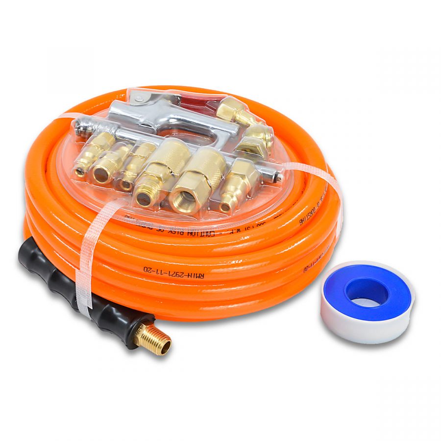 - The kit includes a PVC non-marking air hose with high-strength polyester woven braided reinforcement.
