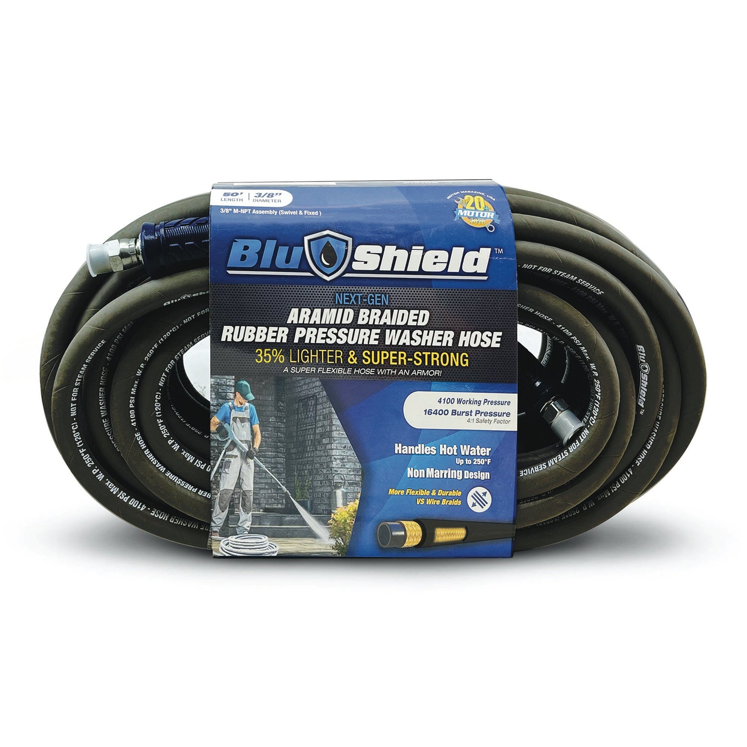 Industry leading 1-year warranty. BluShield Aramid braided rubber pressure washer hoses are unique and one of its kind. These hoses are braided with Aramid fibers, commonly known as Kevlar which makes them 35% lighter than other pressure washing hose while making it true heavy duty. Aramid fibers are well-known for its durability and extraordinary tensile strength and are up to 10 times stronger than steel fibers of equal diameter. These 100% rubber hoses are extreme weather resistant hoses that can also handles Hot Water upto 250°F while remain flexible in cold weather temperature upto -20°F. Included four finger grip bend restrictors reduces the bending stress near the coupling and increase the working efficiency by adding better control. These hoses have a 4100 PSI working pressure and a 16,400 PSI safety burst pressure (4:1).