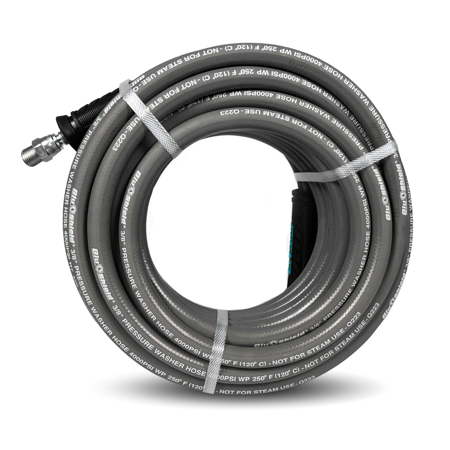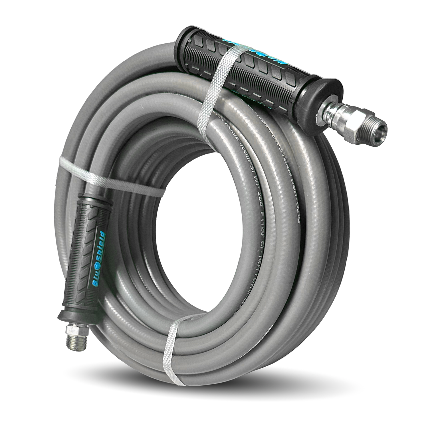 BluShield Single Wire Pressure Washer Replacement Hose is specifically designed to deliver exceptional performance and durability, ensuring a powerful and efficient cleaning experience every time. Crafted with a high tensile single wire steel braided construction, this pressure washer hose guarantees superior strength and longevity. Its high-strength rubber cover provides excellent protection against abrasions and other external damages, allowing for long-term use even in demanding environments. This hose is designed for both hot and cold water use, enabling you to tackle a wide range of cleaning tasks with ease. Included 3/8-inch swivel and fixed male NPT fittings made from rust free Stainless Steel. New ergonomic bend restrictor reduces wear and tear on the connector, ensuring a prolonged lifespan for your hose. The hose boasts a 4:1 safety factor with 4000PSI working pressure. BluShield Pressure Washer Hose offers exceptional weather flexibility. It remains flexible and functional in various climate conditions, allowing you to work comfortably and efficiently, whether it's scorching hot or freezing cold outside. This product is engineered for long-lasting performance, designed to meet the needs of demanding users across residential, commercial, and industrial applications.