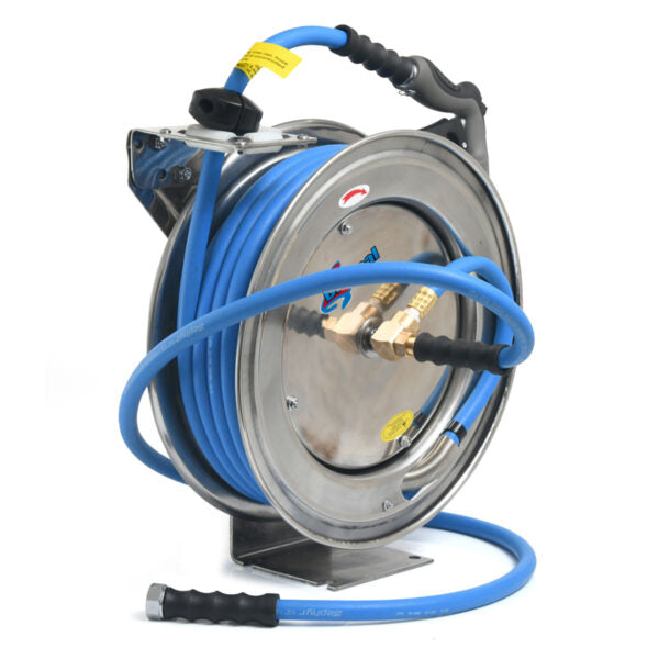 BluSeal Stainless Steel Water Hose Reel 5/8" x 50' Retractable with Rubber Garden Hose, 6' Lead-in, Spray Nozzle - Rubber is backordered and will ship as soon as it is back in stock.