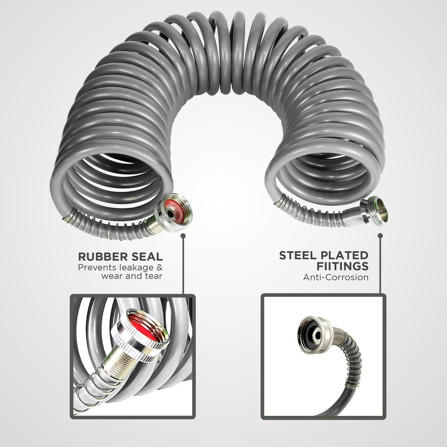 The Avagard Recoil Water Hose, 25' &50' comes in a refreshing shade of Blue, Gold, Green, Grey and Light Orange – the solution to your watering conundrums! Tired of tangled and cumbersome hoses? Avagard springs to your aid, extending to reach your watering needs and recoiling for compact storage. Its lightweight, durable design defies outdoor wear and tear, and the nickel-plated brass coupling resists corrosion. No leaks, no kinks – just effortless, problem-solving watering. Transform your routine and upgrade to the Avagard Recoil Water Hose.